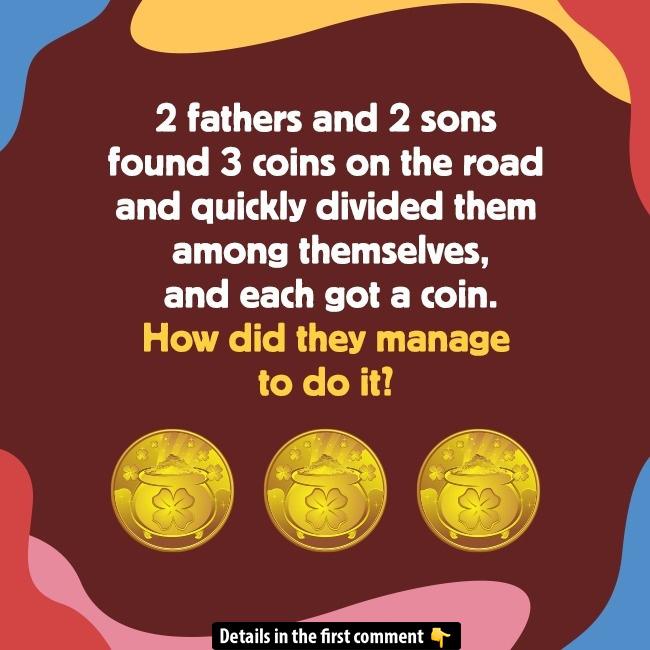 At first glance, it seems impossible: four people (two fathers, two sons) sharing three coins yet each walks away with one. How can everyone get paid? This riddle tests your ability to question assumptions and spot hidden relationships. Can you see beyond the surface count of “two fathers” and “two sons” to solve the mystery?